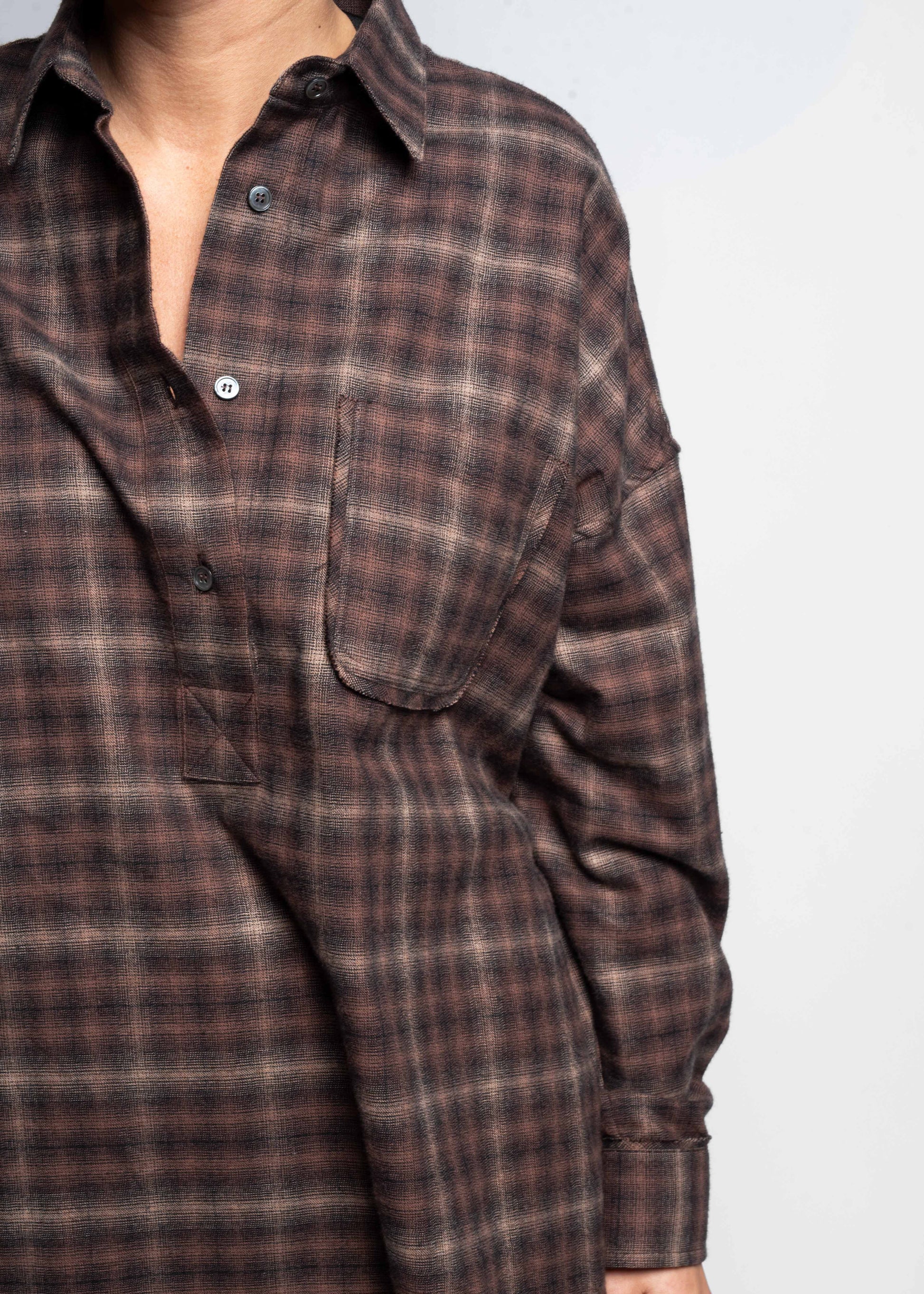 Camicia over in morbida flanella, dal taglio ispirato al modello polo, caratterizzata da una tasca laterale funzionale e di stile. Realizzata in 100% cotone, offre comfort, calore e un look casual e rilassato, perfetta da indossare da sola o sopra capi più leggeri per stratificare con stile.