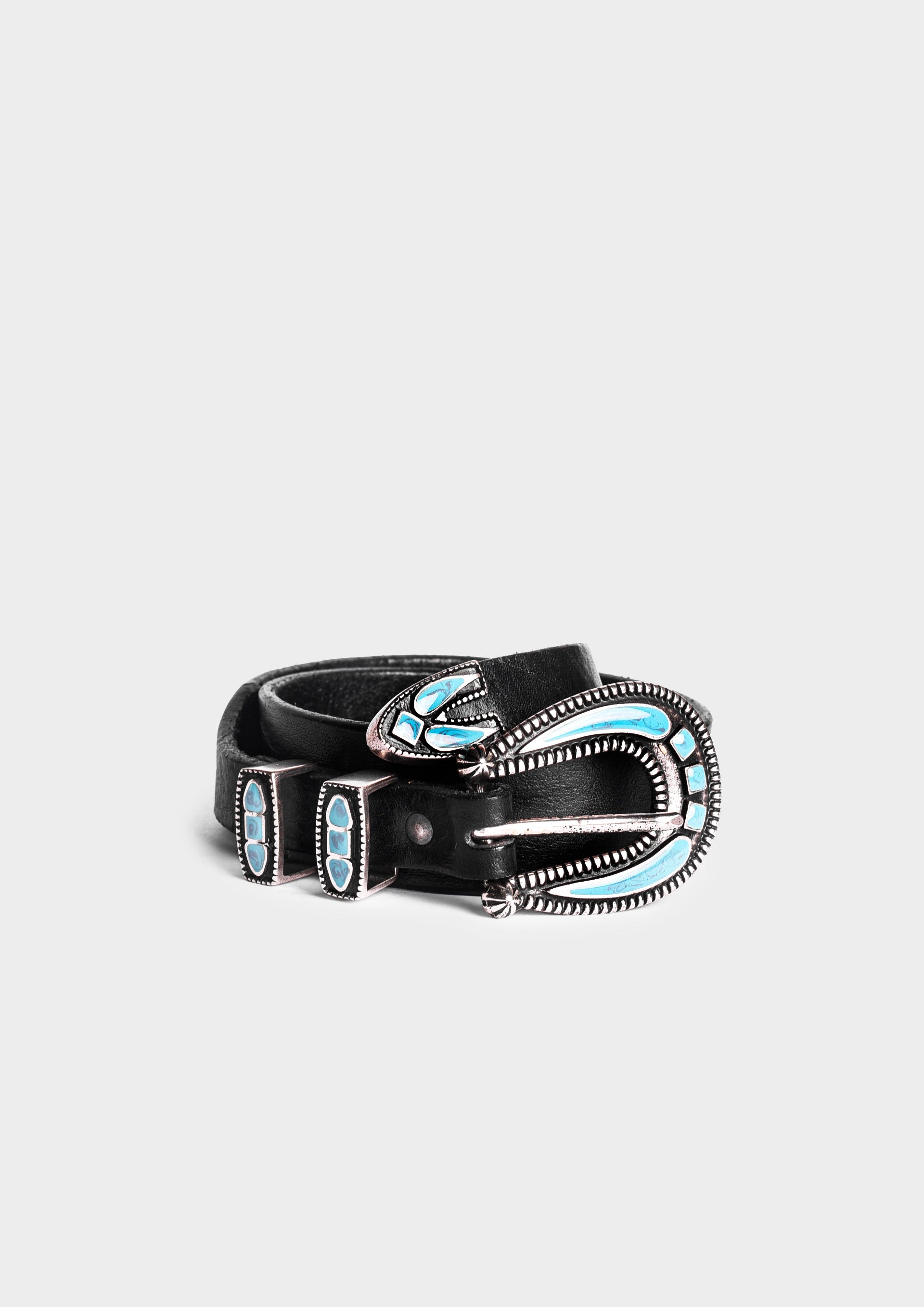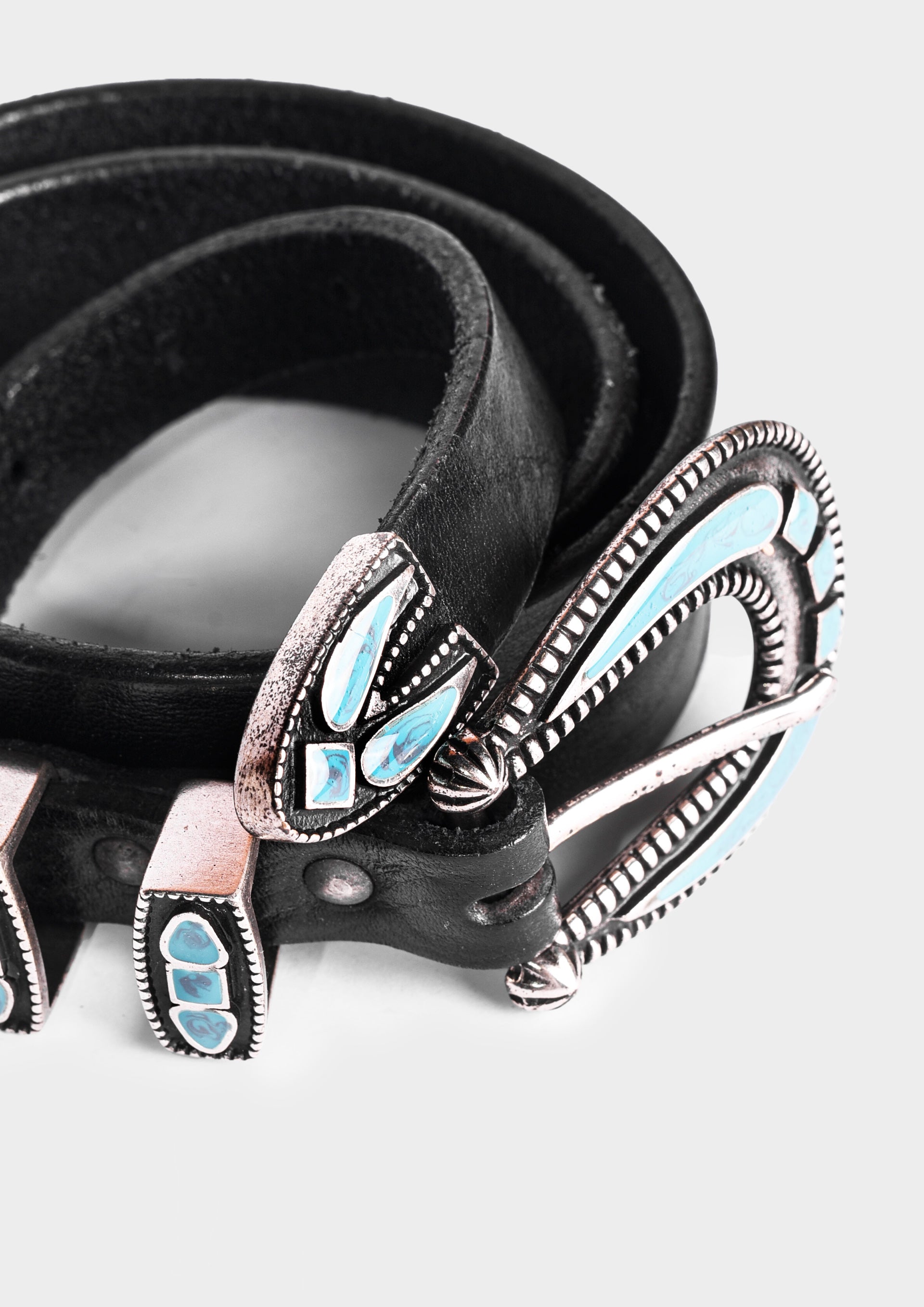 Cintura in pelle nera dal design elegante e ricercato, impreziosita da una fibbia in metallo lavorato con dettagli turchesi. Lo stile western vintage è enfatizzato dalle decorazioni incise e dagli inserti smaltati, che aggiungono un tocco di colore e originalità. Perfetta per completare look casual e boho-chic.
