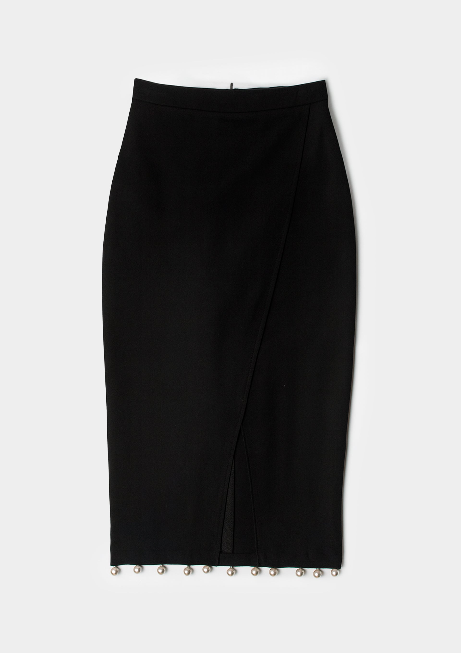 Gonna tubino a portafoglio dal taglio elegante, caratterizzata da una sovrapposizione frontale che valorizza la silhouette. L’orlo finale è arricchito da delicate perle ornamentali che aggiungono un dettaglio raffinato e femminile.