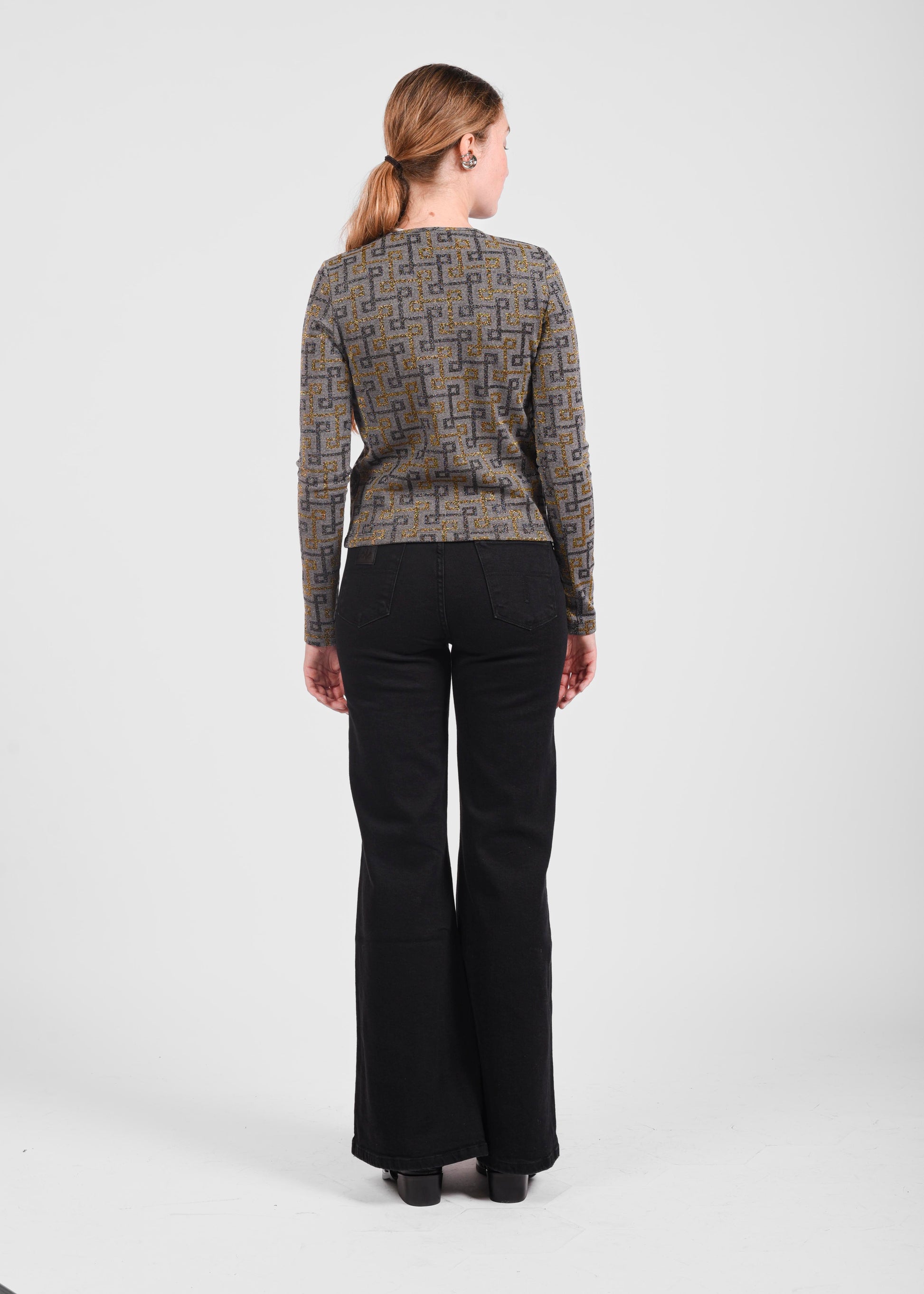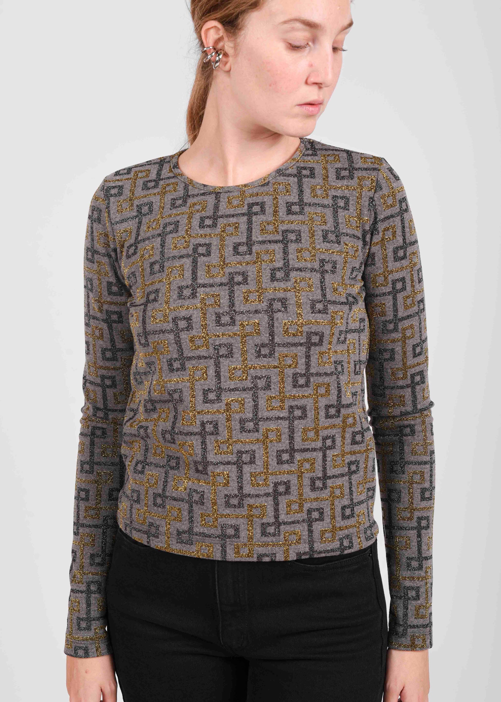 Maglia girocollo corta a vestibilità aderente, realizzata con un tessuto che gioca con fili luminosi intrecciati nella fantasia. Un capo dal carattere moderno e femminile, perfetto per dare un tocco scintillante a look casual o serali. Composizione: 38% poliestere, 26% cotone, 18% metallizzato, 16% poliammide, 2% elastico.
