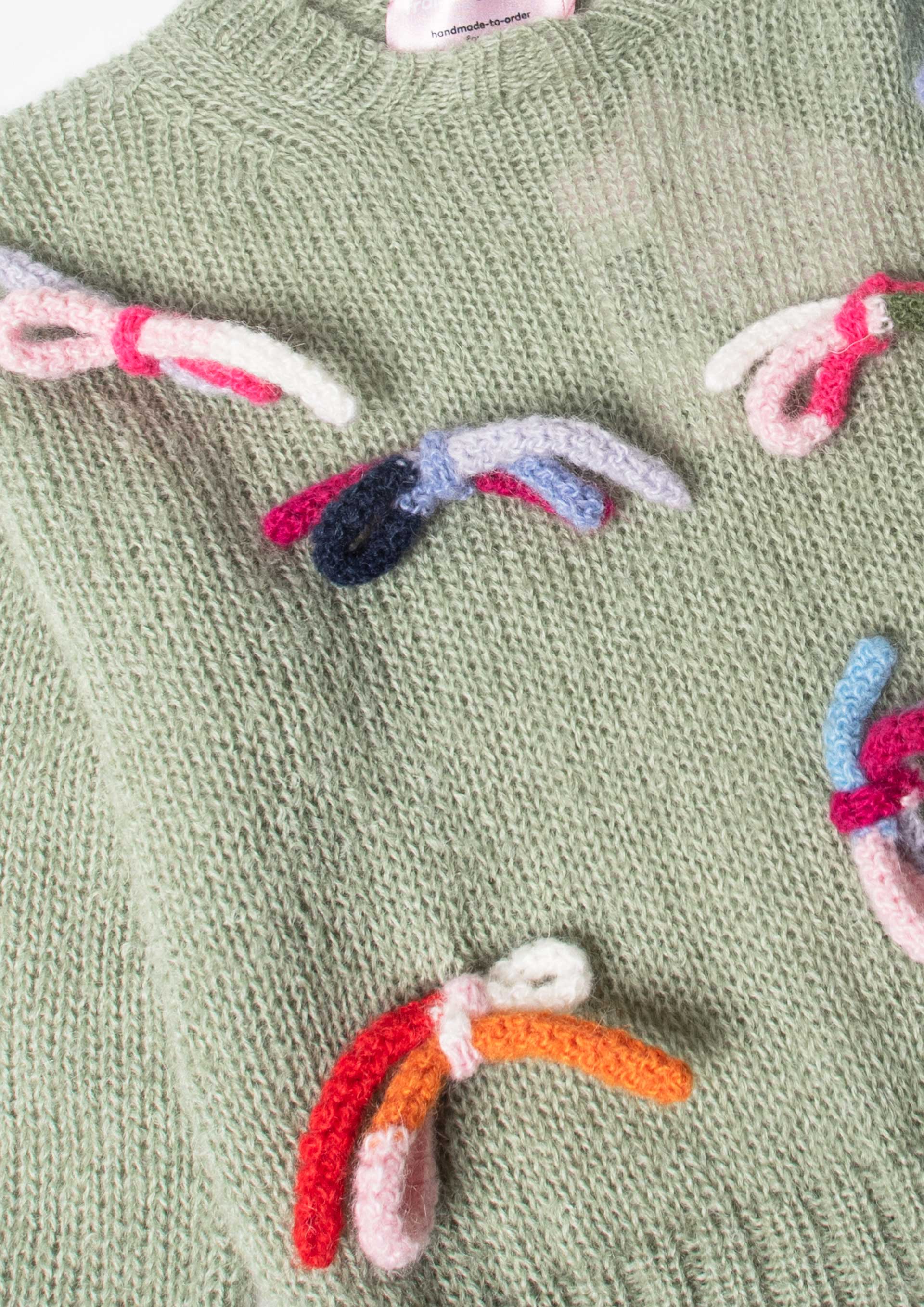 Maglione dalla vestibilità morbida realizzato con un pregiato filato in mohair (morbido e che non pizzica), impreziosito con nastri multicolor realizzati all'uncinetto.
