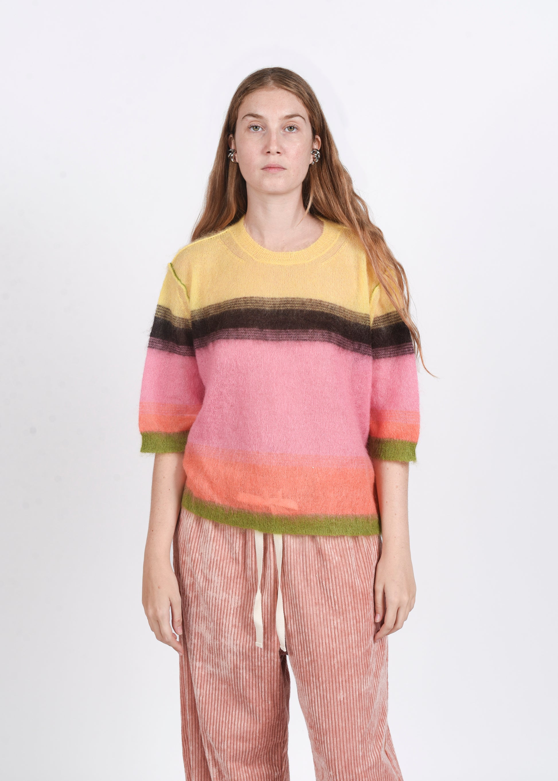 Maglione girocollo a righe dal taglio boxy, caratterizzato da un fit morbido e moderno. Le maniche al gomito donano un tocco casual-chic, perfetto per look versatili e quotidiani. Realizzato in una pregiata miscela di filati con 50% Superkid Mohair, 39% Poliammide e 20% Lana, assicura leggerezza, morbidezza e calore con un finish soffice e raffinato.