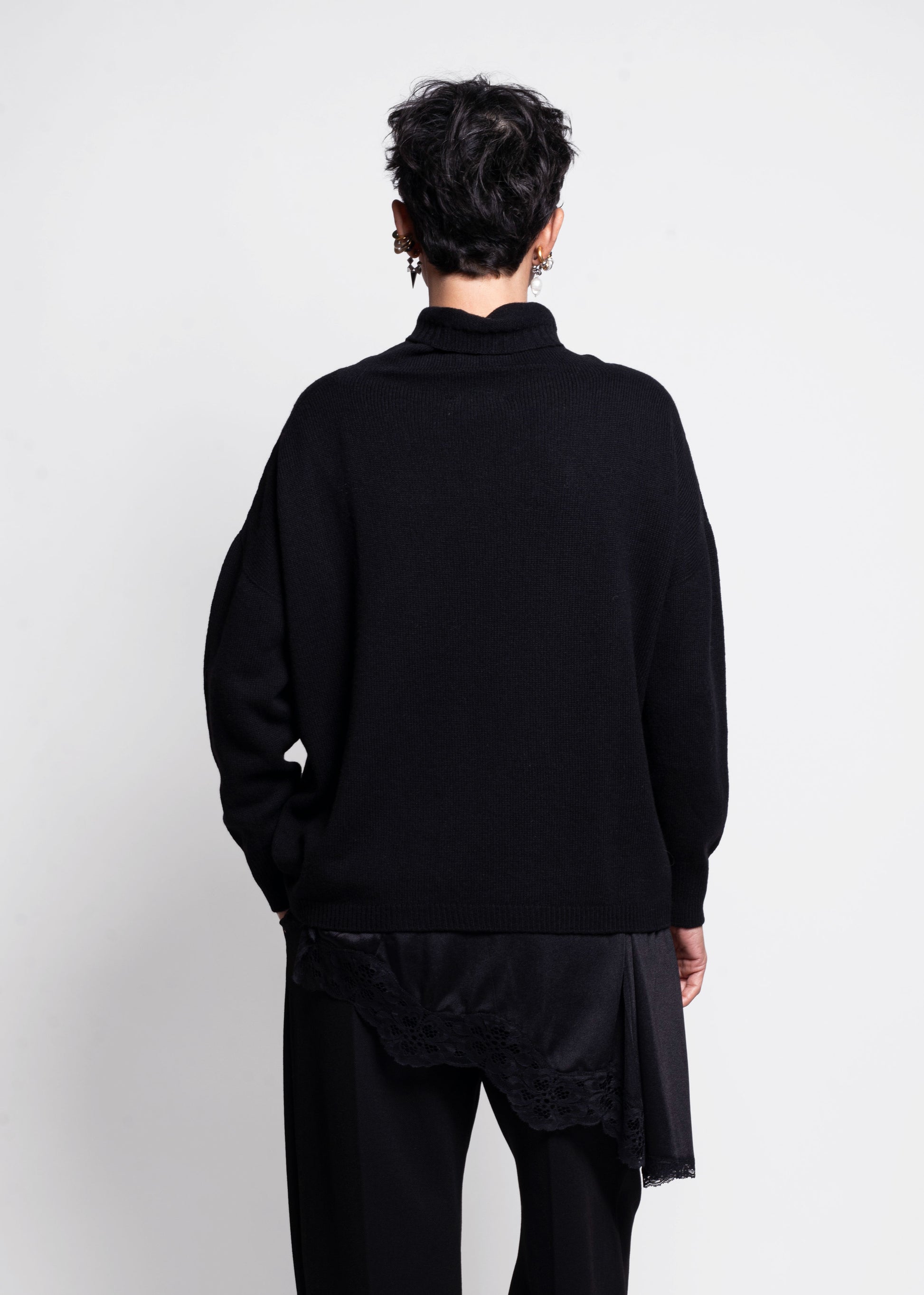 Maglione a scatoletta over in 100% lana merino, caratterizzato da un collo alto morbido e da una linea leggermente accorciata tipica del taglio “a scatoletta”. La parte superiore della spalla è realizzata con un lavoro a maglia più sottile e leggermente trasparente, che crea un delicato contrasto con il corpo del maglione, più pieno e avvolgente.