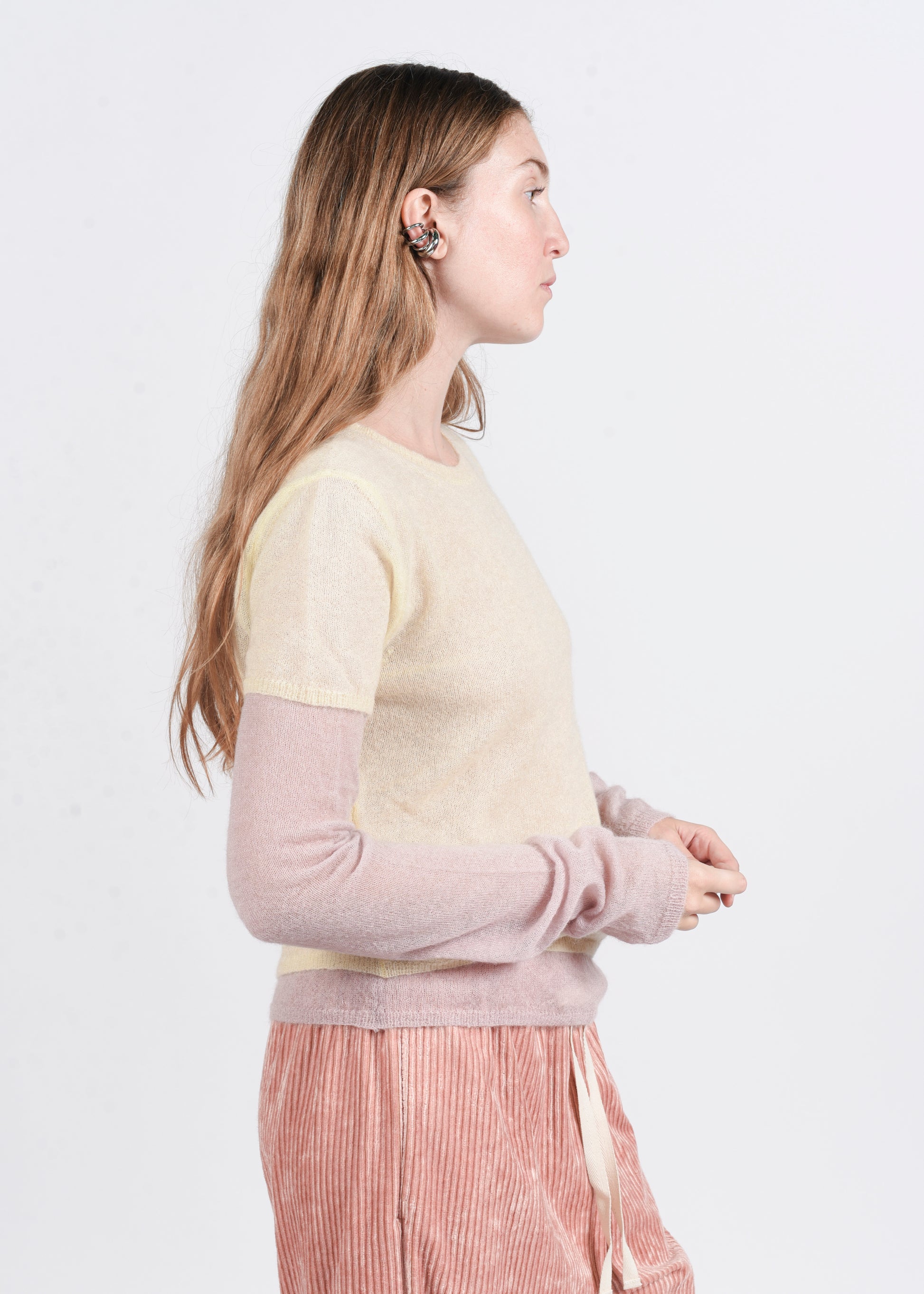 Maglione doppio sovrapposto con girocollo, manica lunga in colore grigio e mezza manica in colore rosa, per un effetto contemporaneo e originale. Realizzato in una lussuosa miscela di 35% Baby Alpaca, 35% Superkid Mohair e 30% poliammide/nylon, offre morbidezza, calore e leggerezza.