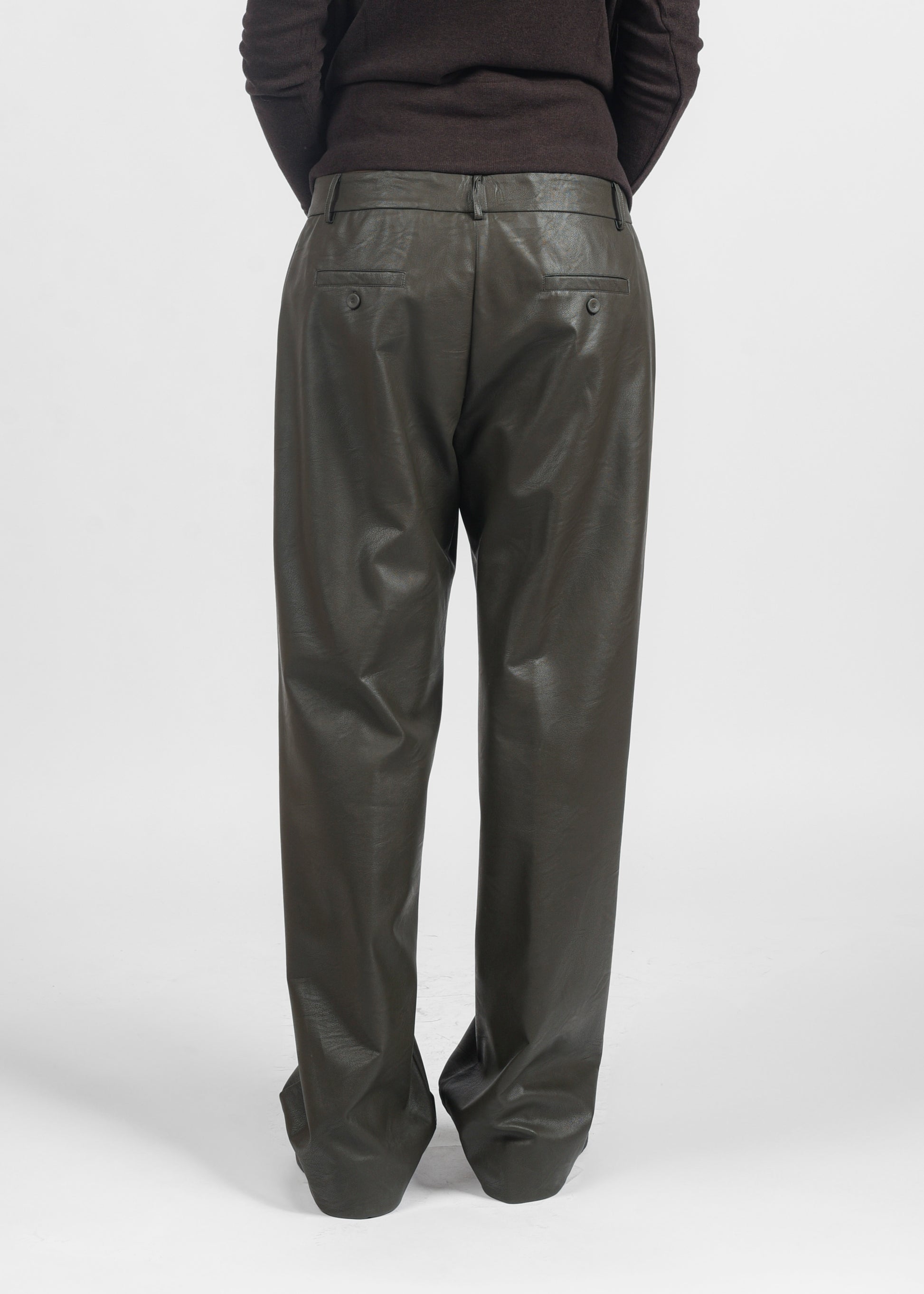 Pantalone dritto in eco-pelle con vestibilità regolare. Presenta due tasche posteriori, passanti in vita e lunghezza fino ai fianchi, per un look contemporaneo e strutturato. Realizzato in 55% viscosa e 45% poliuretano, con fodera interna in 67% poliestere e 33% acetato, garantisce comfort e vestibilità ottimale.