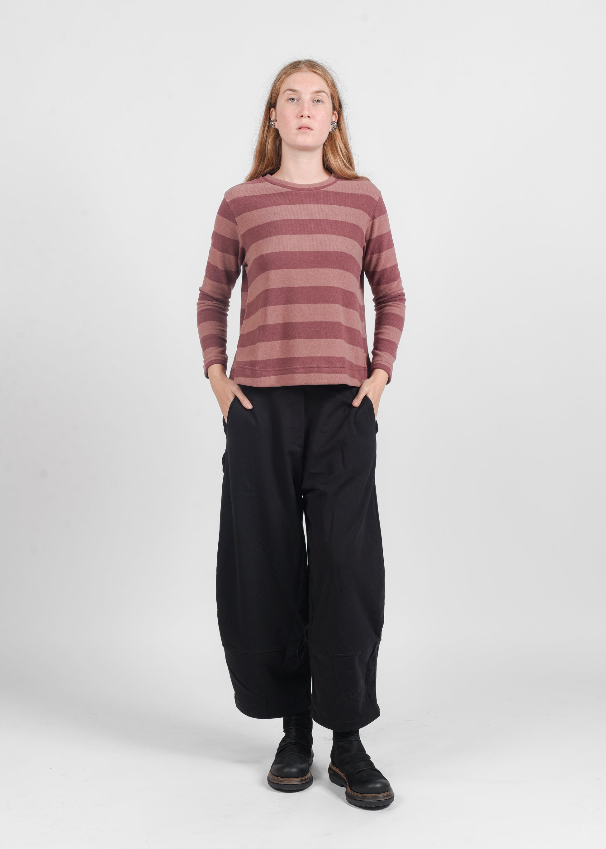 Pantalone modello ovetto, lunghezza al malleolo, con elastico in vita per una vestibilità comoda. Presenta una tasca a patta sul retro della gamba destra. Realizzato in 95% cotone e 5% elastan, offre comfort, elasticità e facilità di movimento.