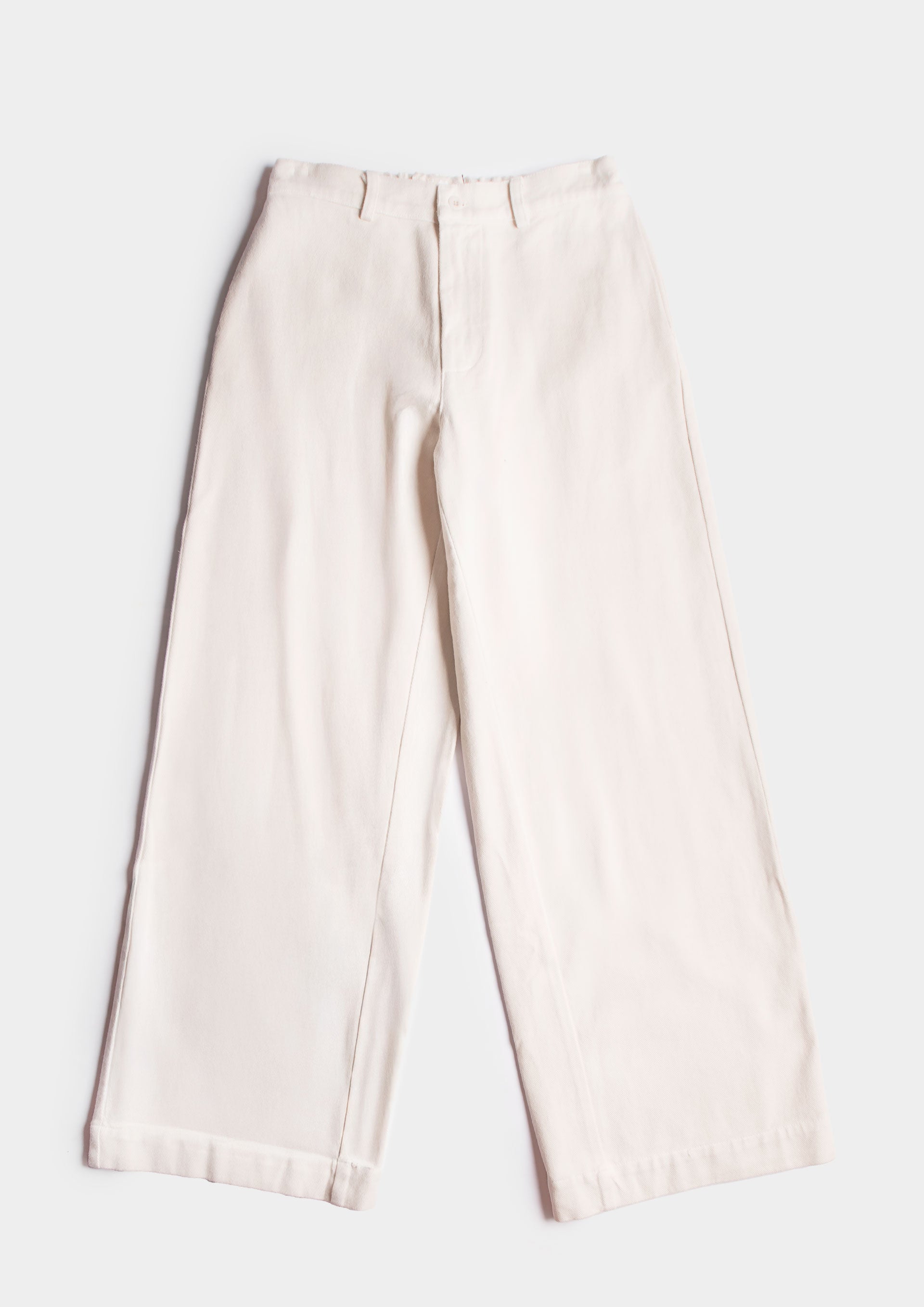 Pantalone palazzo in flanella con elastico dietro (in vita) e tasche a filetto.