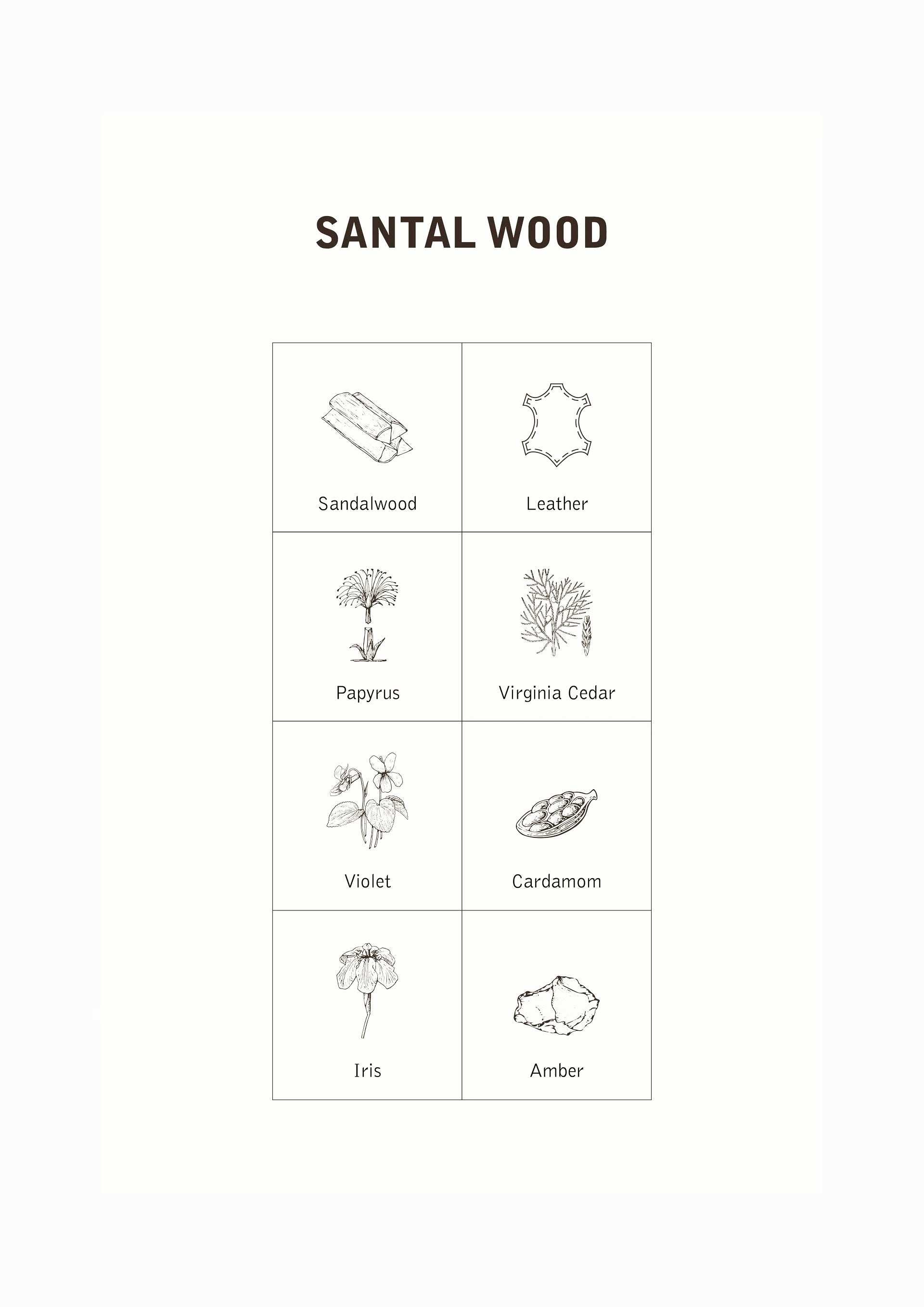 È un'essenza fresca e avvolgente in cui sandalo e cuoio si intrecciano con note speziate e legnose, creando una fragranza sofisticata e senza tempo.