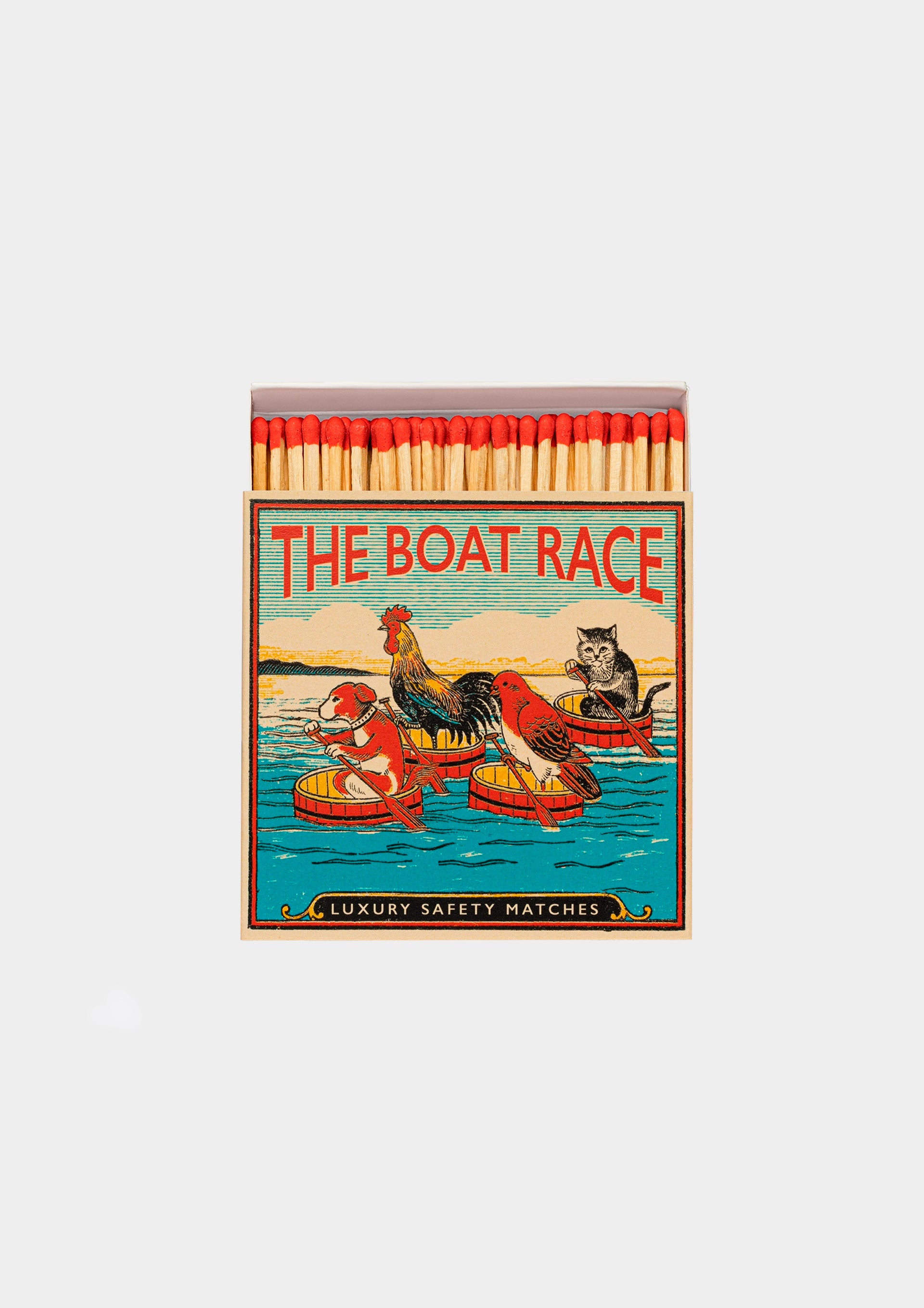 Scatola di fiammiferi quadrata con illustrazione di un gatto, un cane, un pollo e un uccello che partecipano a una gara di barche, con la scritta "The Boat Race" nella parte superiore. Contiene 125 fiammiferi lunghi 10 cm, ideali per accendere candele o aggiungere un tocco di allegria a tavolini, caminetti e cassetti portaoggetti.
