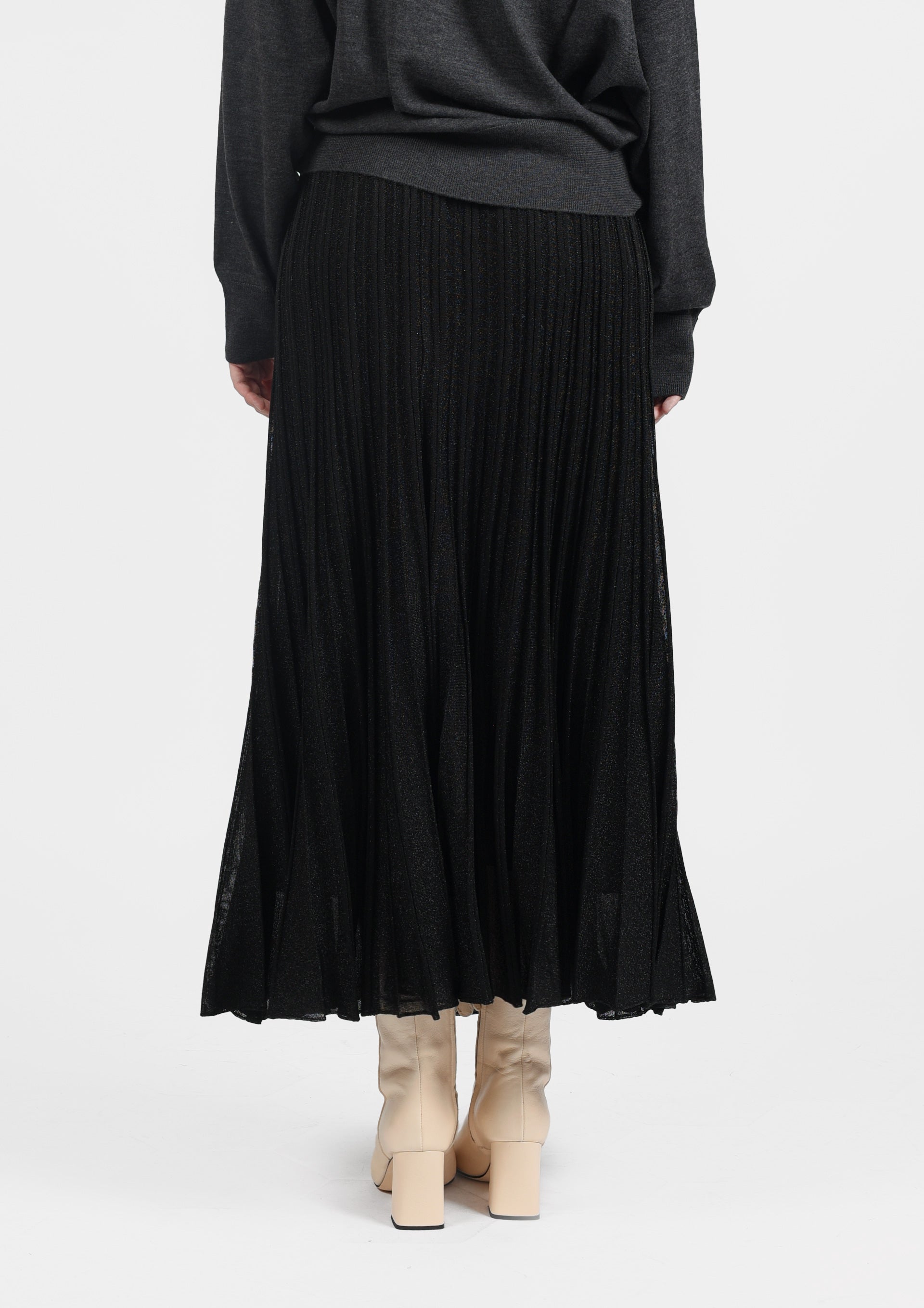 Gonna con elastico in vita, caratterizzata da una lavorazione plissé che dona movimento e leggerezza. Il filo lurex inserito nel tessuto la rende particolarmente luminosa ed elegante, ideale per look serali e sofisticati. Composizione: 56% viscosa, 29% cupro, 15% poliestere metallizzato.
