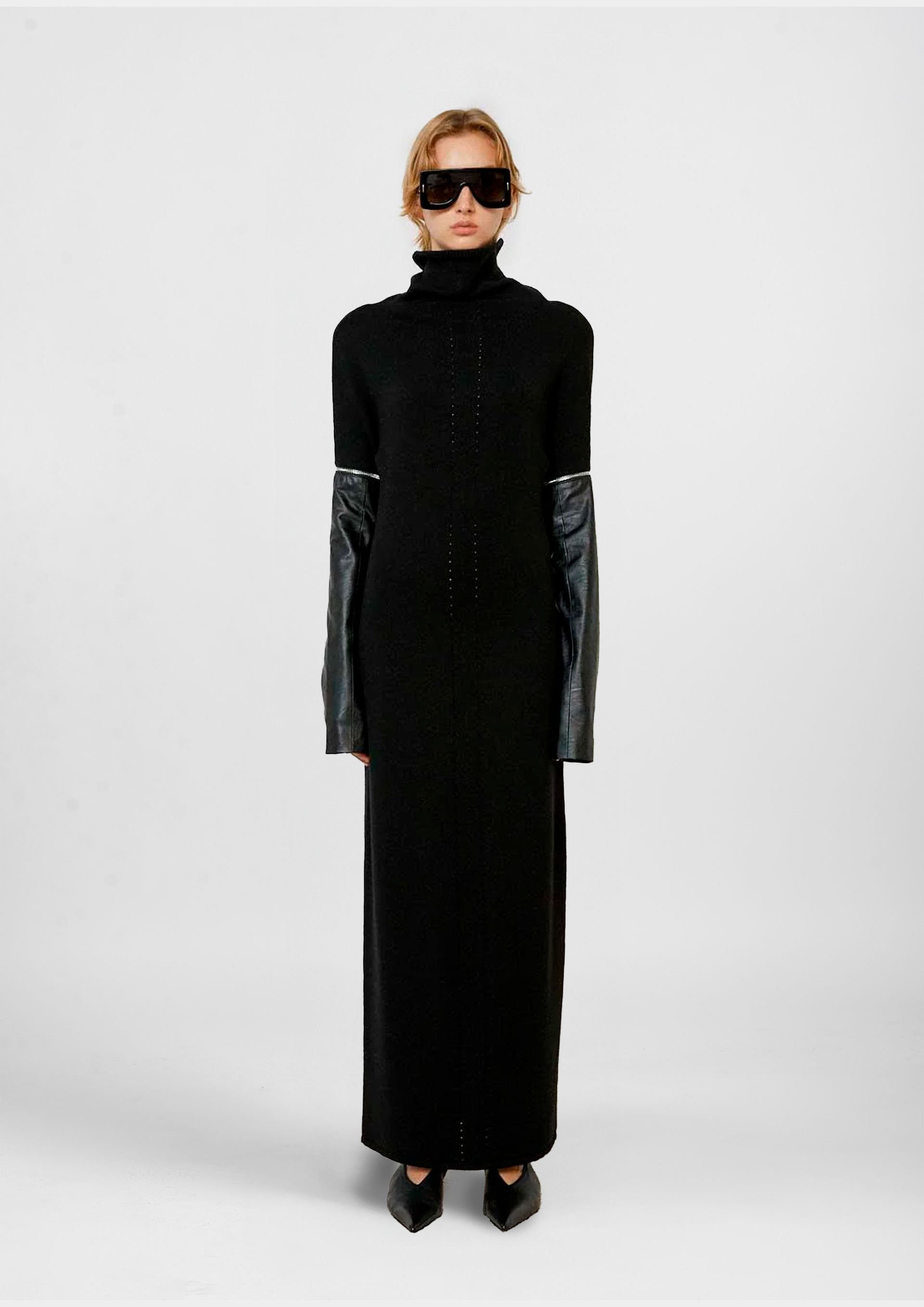 Vestito lungo in lana merino dal fit aderente, con collo dolcevita e maniche rimovibili. Dettagli in eco pelle con zip a contrasto che aggiungono un tocco contemporaneo. Realizzato in tessuti pregiati per unire comfort, versatilità e stile.